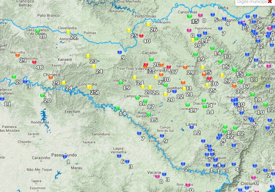 Tempo: céu encoberto na maioria das regiões, com chuva a partir da manhã no Oeste e Norte do Estado, atingindo as demais regiões entre a tarde e noite. Risco de chuva mais intensa e temporal isolado no Oeste, Meio Oeste, Planalto Norte e Litoral Norte.