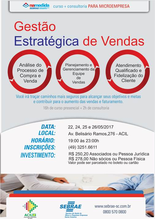 Serão 16 horas de curso presencial e mais 2h de consultoria exclusiva para cada CNPJ inscrito. O curso será realizado nos dias 22, 24, 25 e 26 de maio, das 19h até 23h, nas dependências. Associados da ACIL pagam R$ 250,20 e não sócios R$ 278,00. Inscrições e informações pelo telefone (49) 3251.6611.
