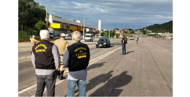 Em uma ação, realizada na SC-401 com o apoio da Polícia Militar Rodoviária, foi abordada uma carreta com 1.344 galões de água mineral sem documento fiscal.